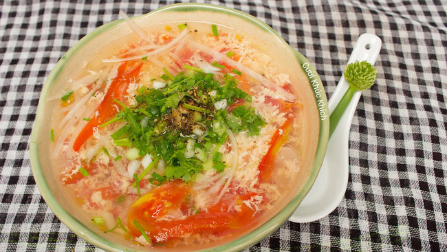 Thành phẩm: Món canh cà chua trứng với những đường vân trứng như những “đám mây” bồng bềnh trông vô cùng đẹp mắt. Nước dùng chua nhẹ, được nêm nếm vừa phải. Đây chắc chắn là một món canh mà ai cũng có thể thực hiện được!
