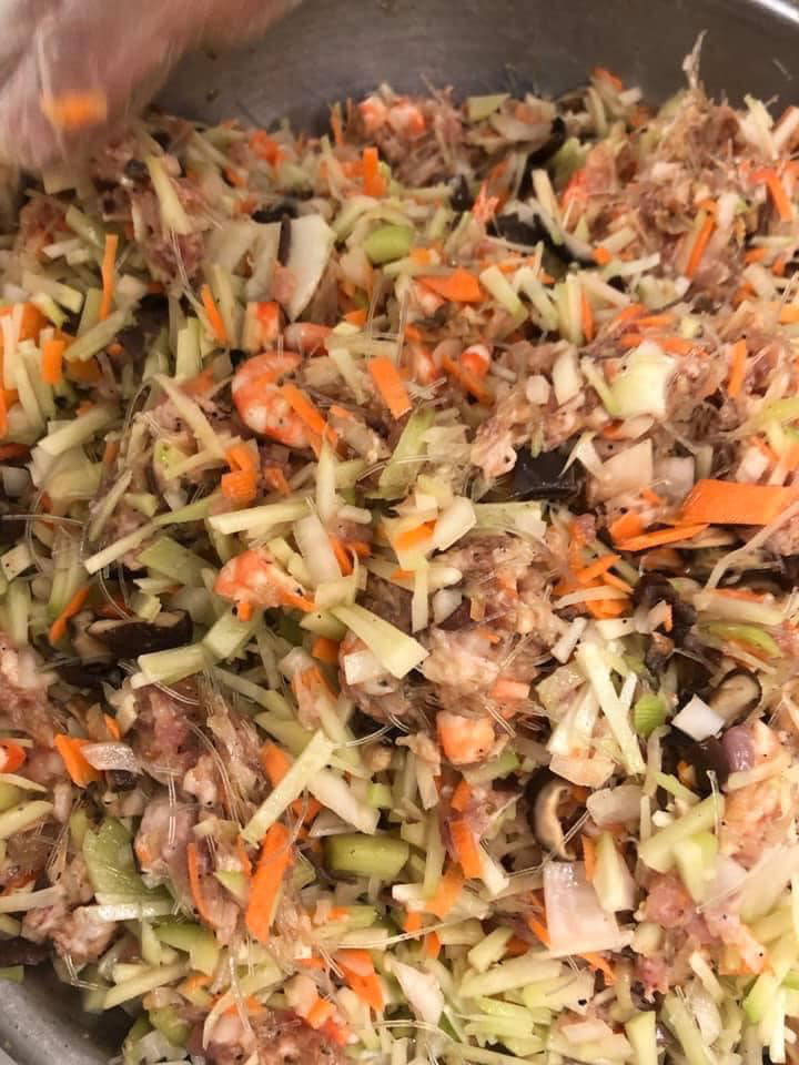 Các loại rau thái mỏng rồi thái sợi. Rau chị Hoàng thường thái chứ không bào vì rau thái sẽ mềm và ngọt hơn. Giá đỗ để riêng trộn vào sau cùng tránh nát nhân. Thái c hút hành lá vào nhân cho thơm chứ không cho rau húng hay rau mùi vào nhân.