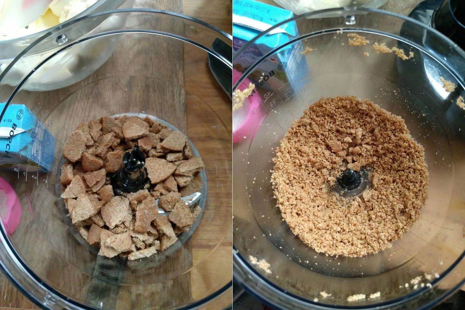 Bánh quy bẻ nhỏ cho vào máy xay, thêm bơ lạt và xay thành bột.