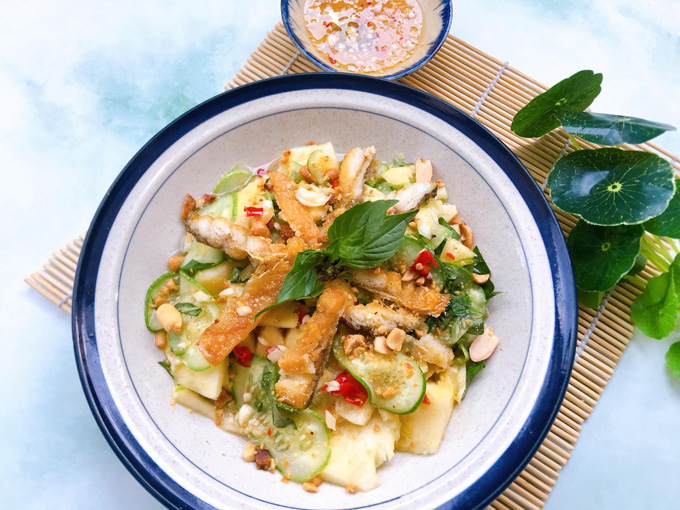Bước 4: Cho phần dứa, dưa leo, lá quế vào tô, chan phần nước mắm vào trộn đều rồi cho ra đĩa. Xếp phần khô cá lên trên cùng lạc rang. Ăn cùng cơm nóng. |