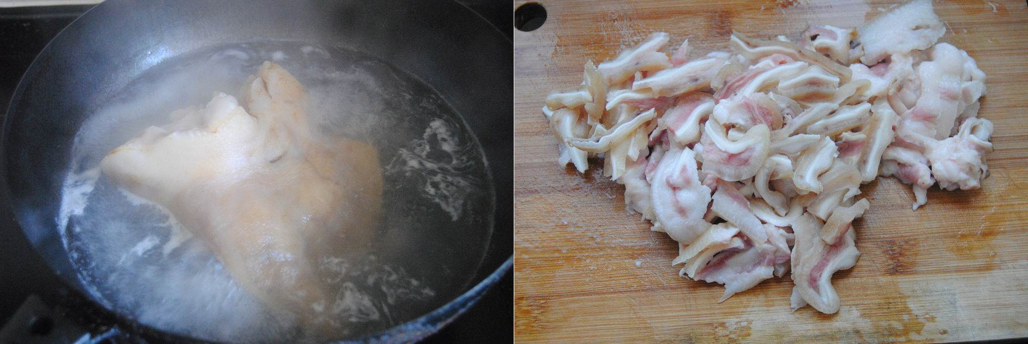 Tai lợn rửa sạch rồi cho vào nồi nước lạnh đun sôi 2 phút, vớt tai lợn ra rửa sạch. Thái tai lợn thành lát.