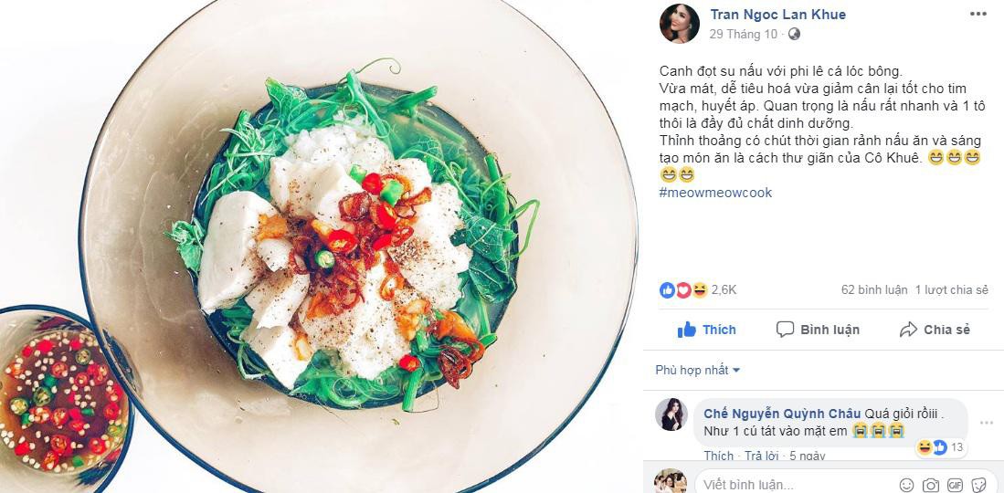 Cô viết, “Canh đọt su nấu với phi lê cá lóc bông. Vừa mát, dễ tiêu hoá vừa giảm cân lại tốt cho tim mạch, huyết áp. Quan trọng là nấu rất nhanh và 1 tô thôi là đầy đủ chất dinh dưỡng. Thỉnh thoảng có chút thời gian rảnh nấu ăn và sáng tạo món ăn là cách thư giãn của Cô Khuê”.