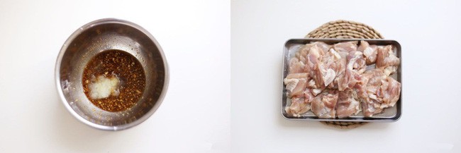 Cho nước tương, siro đường, đường, rượu, giấm vào bát rồi thêm tỏi băm, hành xay nhỏ, hạt tiêu đen vào rồi hòa tan. Thịt đùi gà rửa sạch, thái miếng vừa ăn. Ướp thịt với chút muối, bột gừng, hạt tiêu.